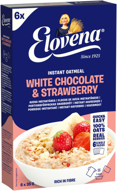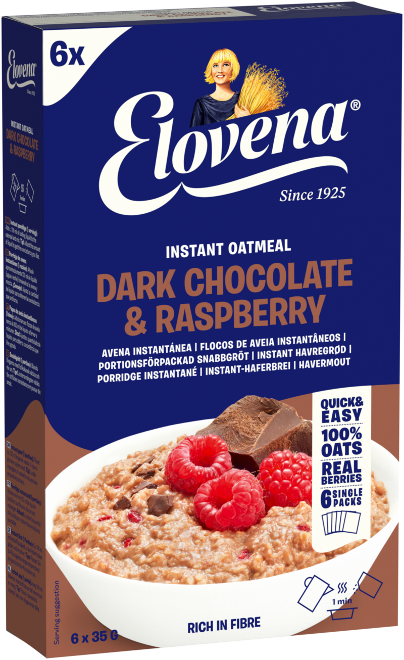 Elovena snabbgröt kombinerar den läckra smaken av choklad och hallon med de bästa sidorna av havregröt. Med den läckra gröten stillar du sötsuget på ett hälsosamt sätt, för denna gröt har beviljats Hjärtmärket av Finlands Hjärtförbund. Tack vare de praktiska portionspåsarna får du din favoritgröt direkt i tallriken, det enda som behövs är kokande vatten.