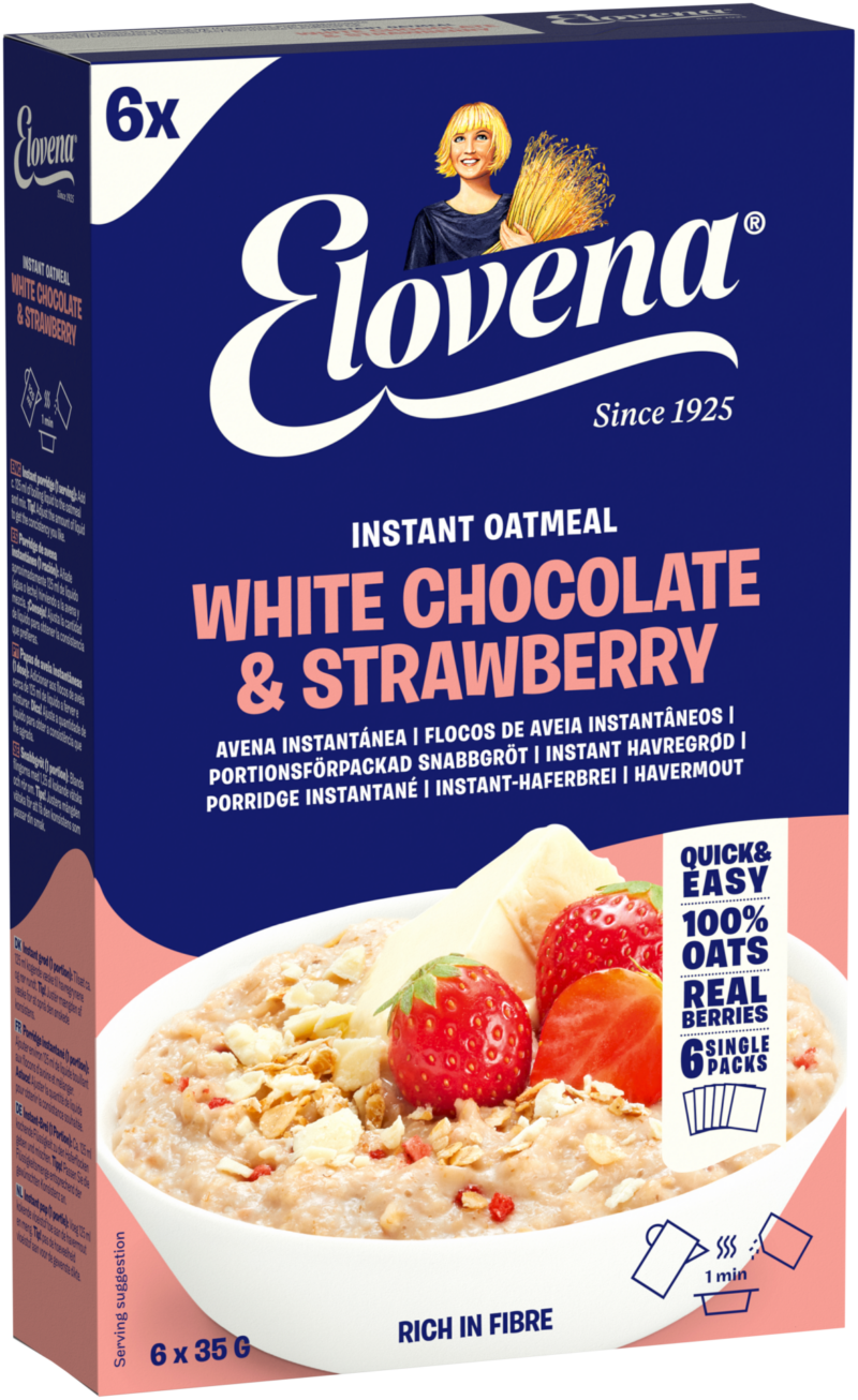 Elovena snabbgröt kombinerar den läckra smaken av vitchoklad och jordgubbe med de bästa sidorna av havregröt. Med den läckra gröten stillar du sötsuget på ett hälsosamt sätt. Tack vare de praktiska portionspåsarna får du din favoritgröt direkt i tallriken, det enda som behövs är kokande vatten.